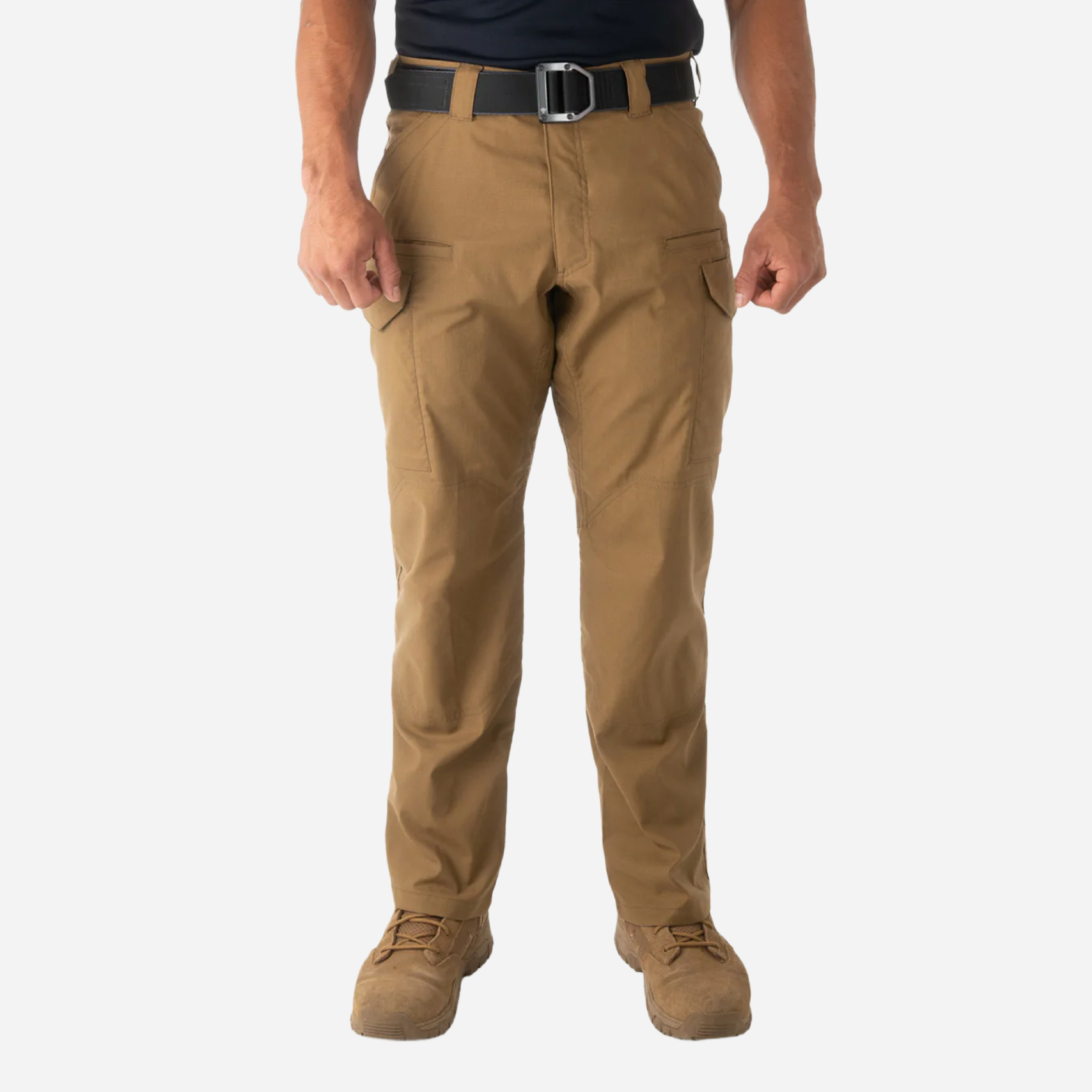 El pantalón V2 utiliza un bolsillo cargo de ribete empotrado, aplicado internamente a la prenda para una integración impecable. El bolsillo incluye un fuelle inferior que permite que el compartimento se expanda al cargarlo, sin depender de un pliegue central, diseñado específicamente para reducir los enganches durante el movimiento. Una solapa de borde biselado (aproximadamente 6,35 cm de ancho) con doble cierre de velcro asegura el bolsillo y también se puede plegar para crear una configuración de bolsa de descarga.